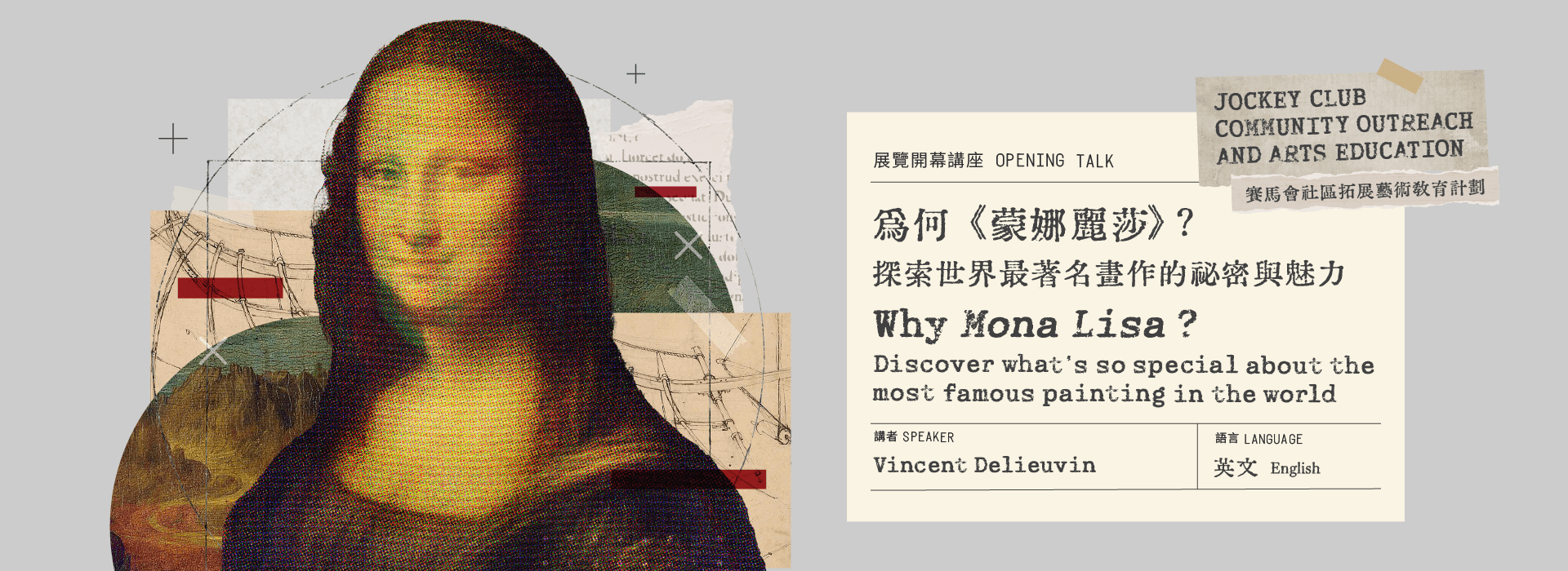 羅浮宮義大利文藝復興繪畫部策展人、亦為多場達文西重要展覽之策展人的Vincent Delieuvin,將於本場講座中回應這些核心問題。他將引領觀眾回顧《蒙娜麗莎》耐人尋味的歷史脈絡、圍繞其人物身分的長久辯論,以及李奧納多・達文西透過此作所展開的藝術與思想探索。同時,也將介紹近年運用科學技術所進行的最新研究成果,揭示這件經典作品在創作層面上的諸多祕密。